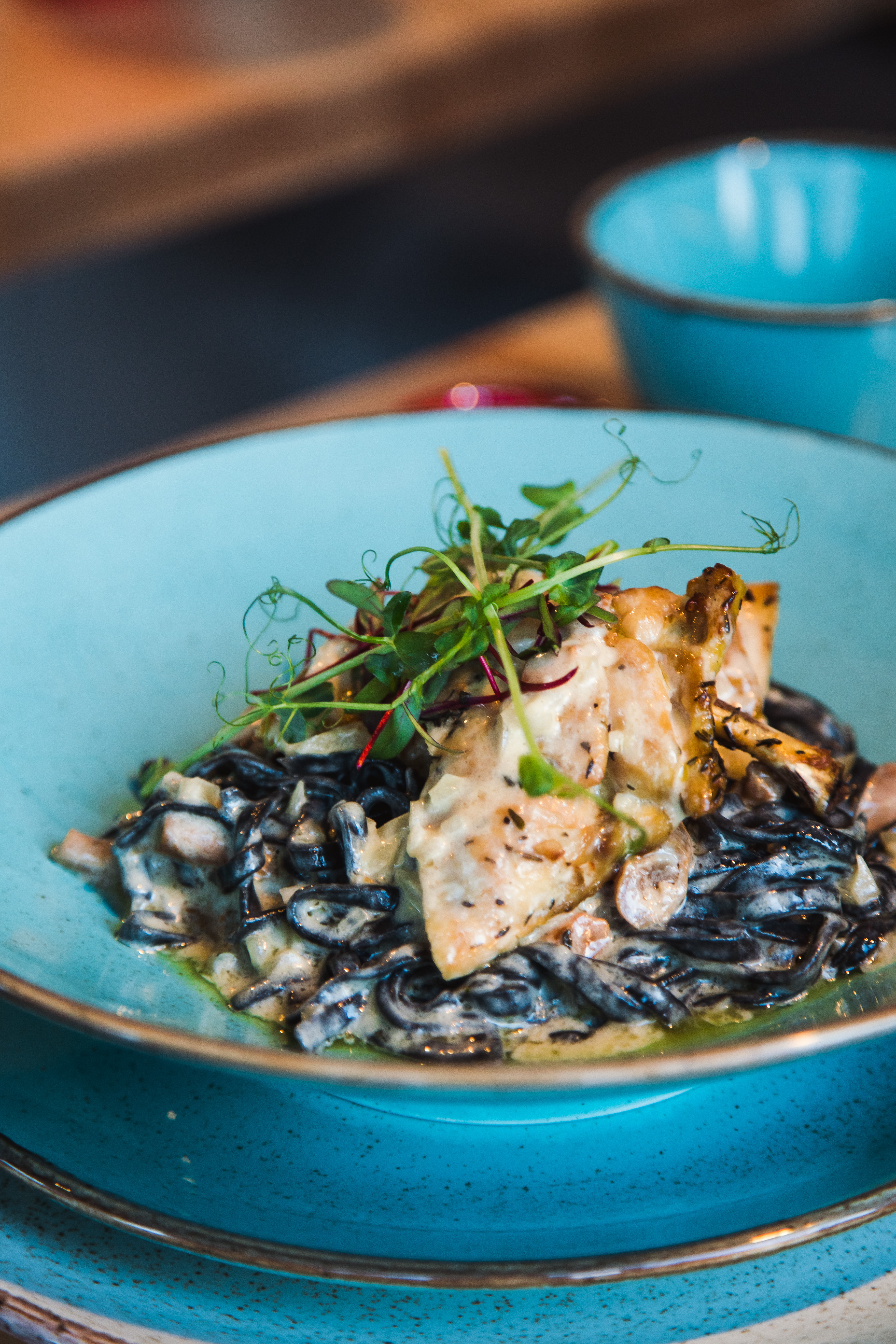 z makaronem nero / pomidorkami koktajlowymi / kolendrą