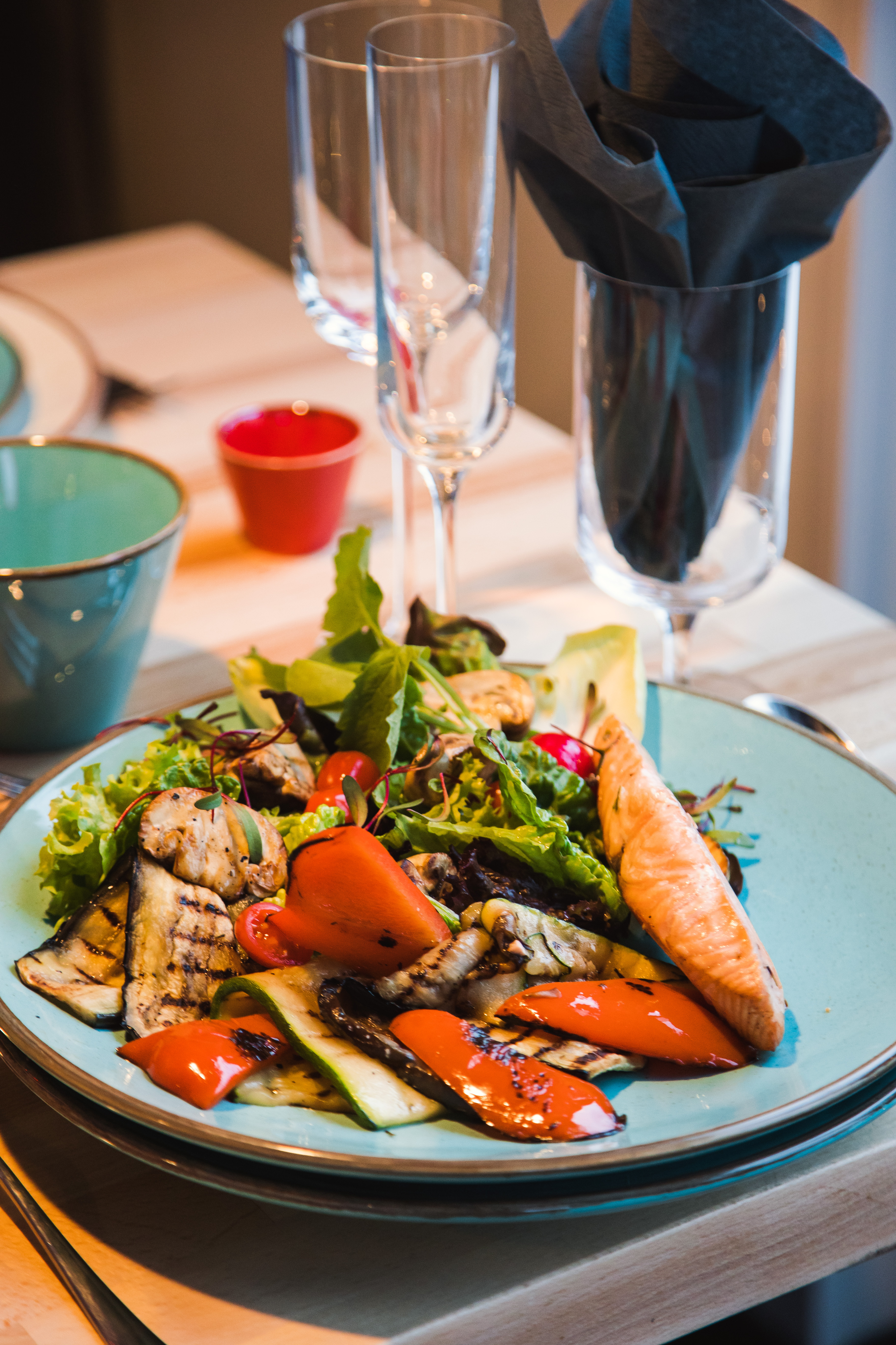 cheddar, sałata, grillowana cukinia, panierowany boczniak, sos, frytki
